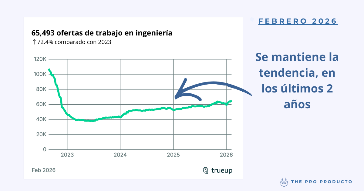 En los últimos 2 años, las ofertas de trabajo a nivel general en tecnología se han mantenido. Si bien hay un aumento del 71.5% vs 2023, esto no significa necesariamente que exista un alza en la demanda. En mi opinión, se mantiene estable el mercado laboral para los Product Managers.