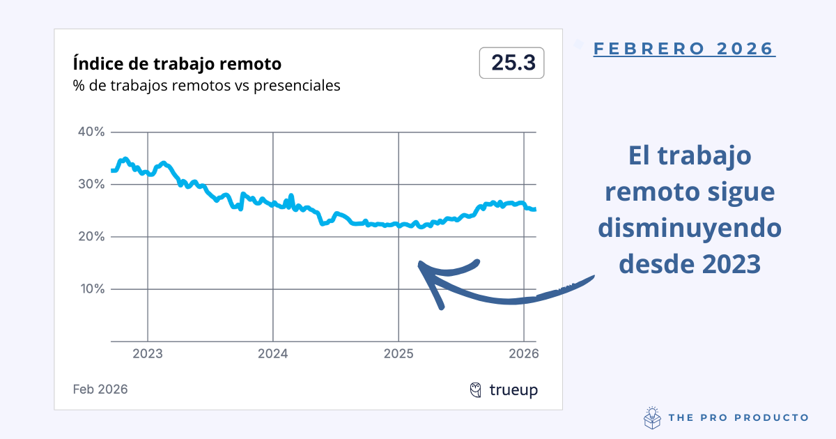 La proporción de roles remotos ha seguido cayendo. No cae en picada, ha tenido un leve aumento en los últimos meses, pero tendremos que esperar para ver una tendencia clara a cierres del año 2026. Pareciera que hemos llegado a una línea base. Un punto de equilibrio entre la oferta presencial vs remota.