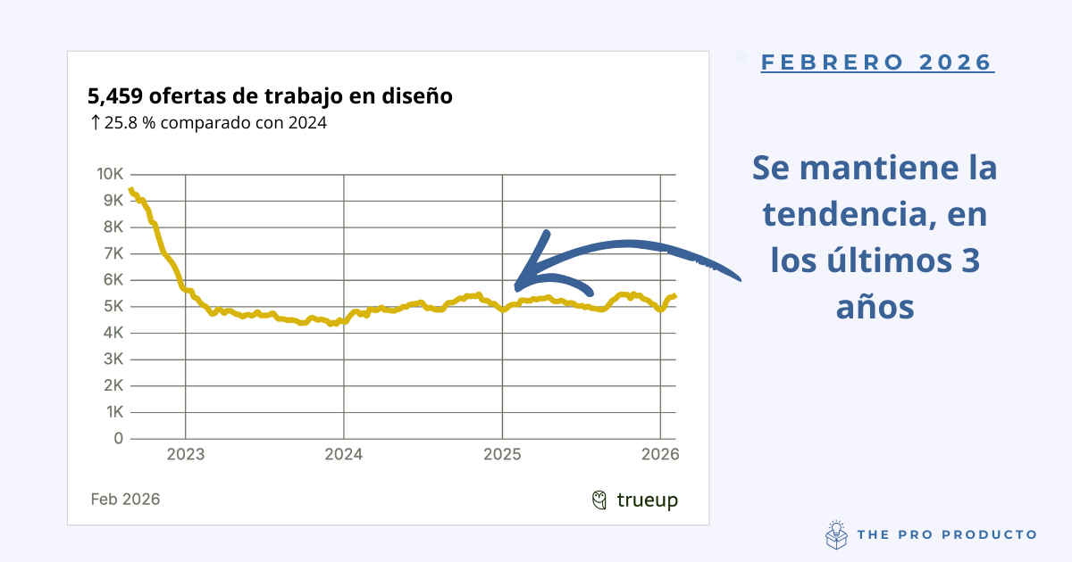 Hoy en febrero 2026, hay 33,604 ofertas roles abiertos en IA y de esos 14,118 (42%) son en ingeniería de software, 8,933 (26.5%) en Inteligencia Artificial, 2,422 (7.2%) en Data. Quedando 1,099 (3.2%) para Product Managers y no apareciendo alguno relacionado con Diseño UX/UI.